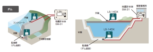 ○構造物の安全管理 ダムの基礎部と天端で観測したデータは堤体の点検、管理に活用できます。 また地震動の解析データは、設計に反映できます。 ※本機2台以上による連動動作で、より多くの観測点に対応します。 ※携帯電話へのメール送信システムとの連動により、地震の把握、 その後の対応判断に有効です。 |