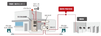 ○工場などの避難誘導・制御など 非常放送設備との連動により避難誘導に加え、工場ラインの制御、設備の保護、同時に火災などを誘発する装置を制御します。 ※接点出力ユニットSZ-31Pにより、接点出力を最大6段階まで 増設可能です。 ※イントラネットにより、支社・工場・営業所を含む防災ネット ワーク構築にも活用できます。 |